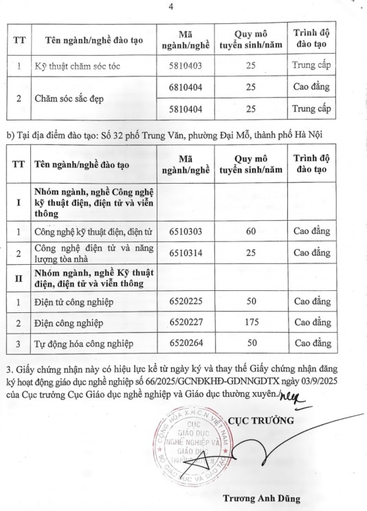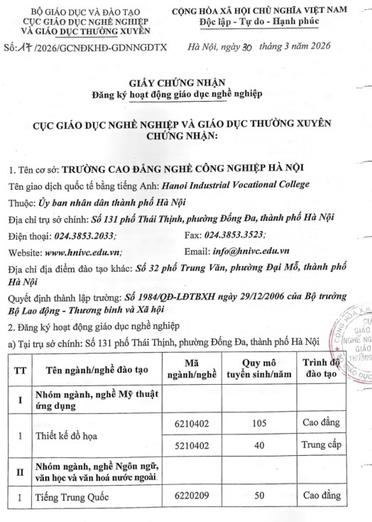 Giấy chứng nhận đăng ký hoạt động giáo dục nghề nghiệp số 17/2026/GCNĐKHĐ-GDNNGDTX do Bộ GD&ĐT cấp ngày 30/3/026