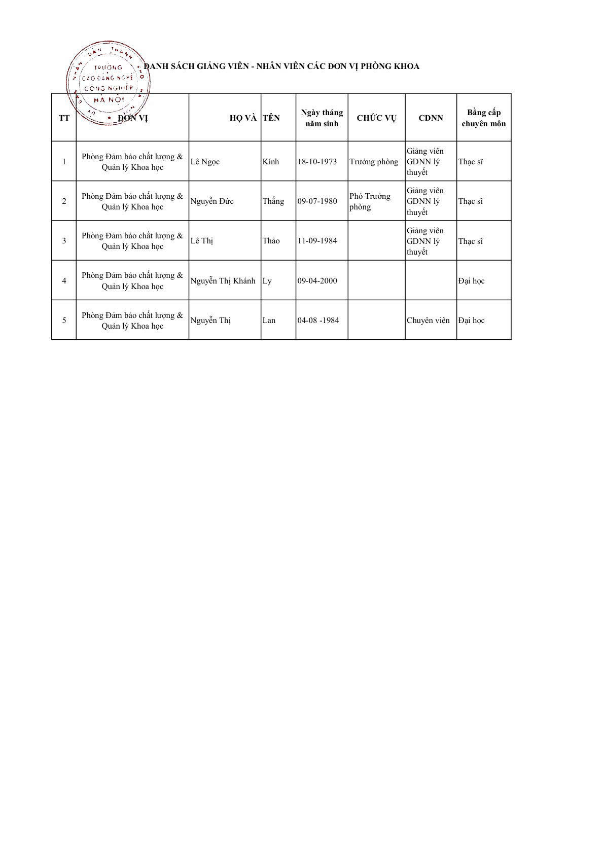 Phòng Đảm bảo chất lượng & Quản lý khoa học
