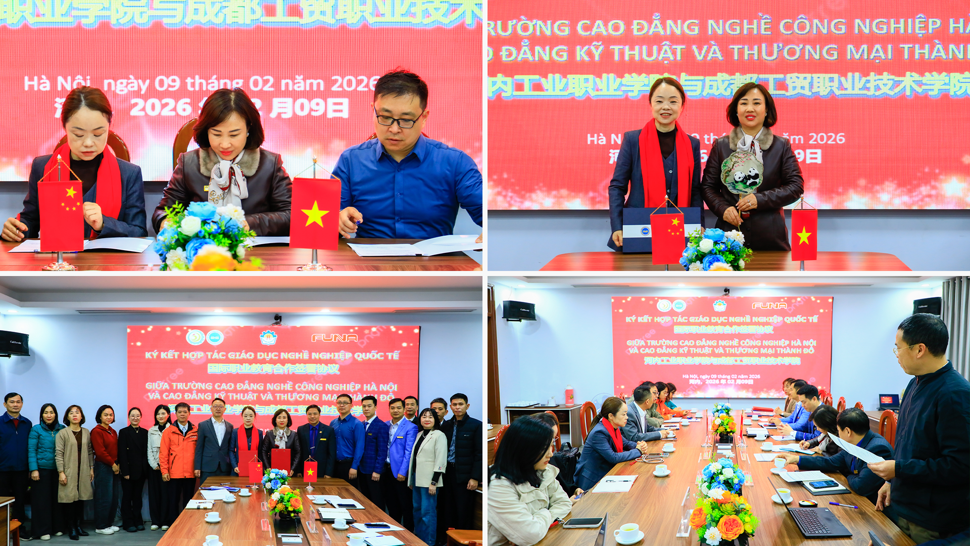 Sáng ngày 09/02/2026, tại Trường Cao đẳng Nghề Công nghiệp Hà Nội đã long trọng diễn ra Lễ ký kết hợp tác giáo dục nghề nghiệp quốc tế giữa HNIVC, Công ty TNHH Công nghệ Tô Châu FUNA-AI Việt Nam và Trường Cao đẳng Kỹ thuật và Thương mại Thành Đô (Tứ Xuyên, Trung Quốc).