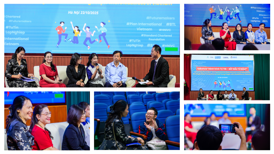 Phần talkshow cũng có chia sẻ và định hướng từ bà Lê Thị Thùy Dung – Trưởng phòng Trách nhiệm & Xã hội, Ngân hàng Standard Chartered Foundation, và bà Lê Quỳnh Lan – Giám đốc Tổ chức Plan International Việt Nam.