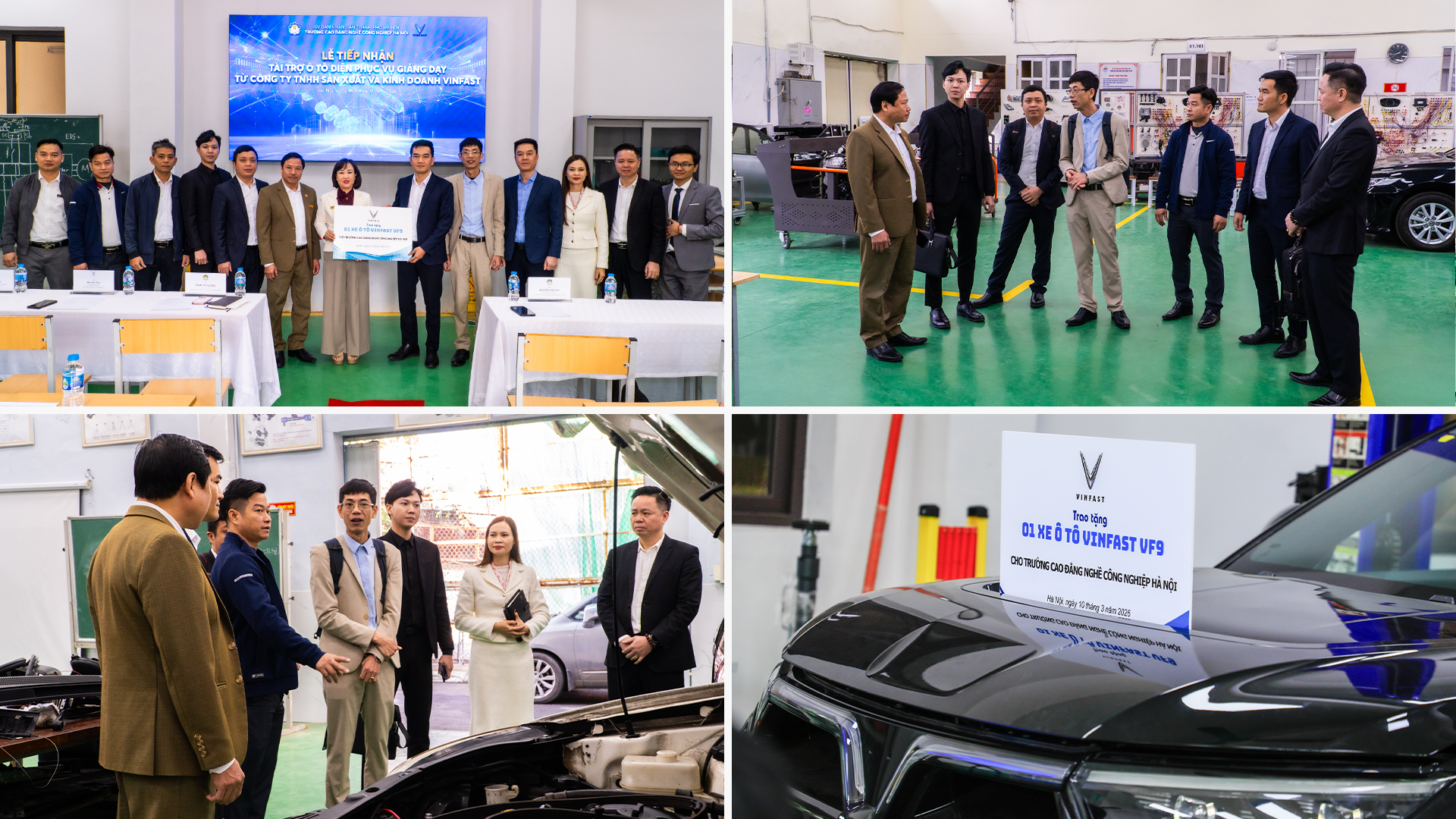 Theo nội dung hợp tác, VinFast đã trao tặng 2 xe ô tô điện (VF9 và VF6) cùng nhiều thiết bị thực hành và giáo trình đào tạo kỹ thuật sửa chữa ô tô điện chuẩn chính hãng. Đây là nguồn học liệu và thiết bị thực hành quan trọng, góp phần nâng cao chất lượng đào tạo, đồng thời giúp sinh viên sớm tiếp cận với các công nghệ hiện đại đang được ứng dụng trong ngành công nghiệp ô tô.